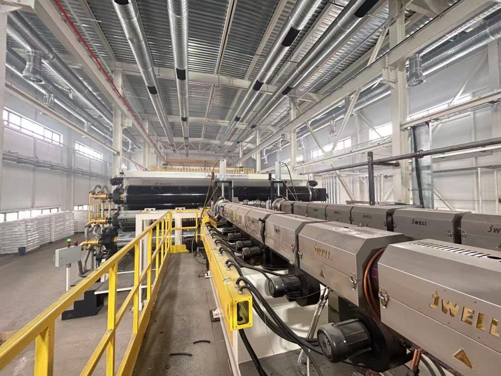 The project’s core is Jwell’s high-performance geomembrane extrusion machine. It is equipped with an intelligent automated control system. This ensures stable operation, low failure rate, and high output (1500kg/h).